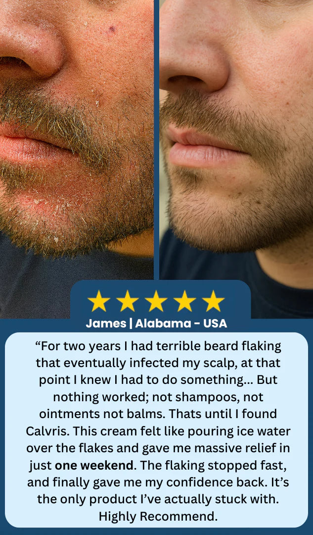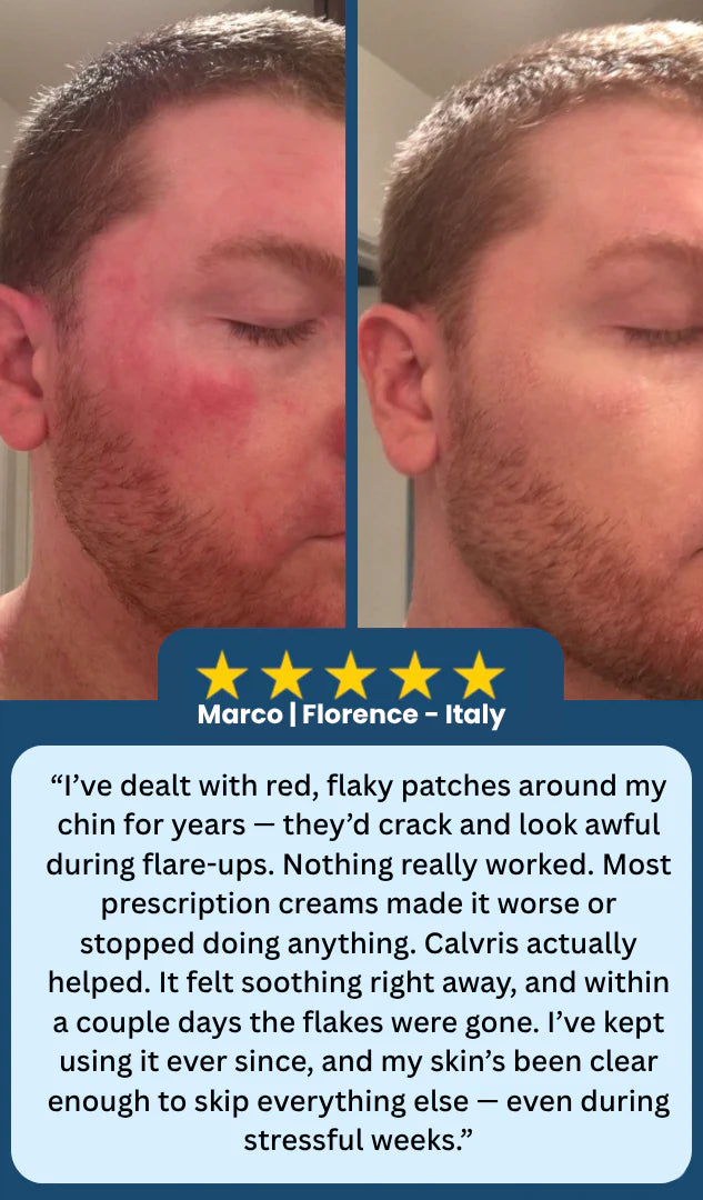 Calvris uses 5 clinically backed natural ingredients designed to soothe irritation, support a balanced skin environment, and help reduce the look of flakes — without steroids or harsh chemicals.